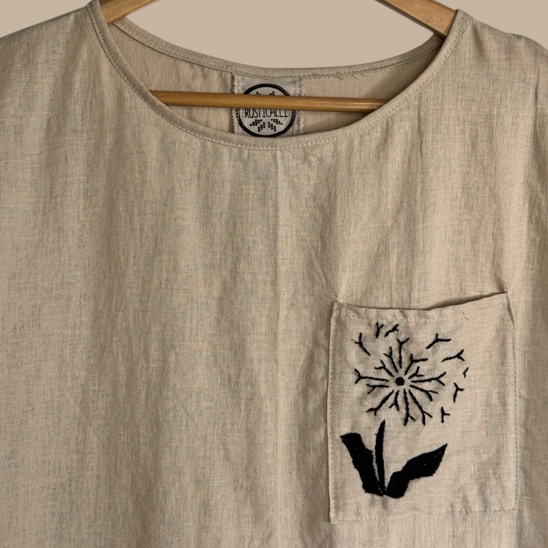 Blusa con bolsillo bordado a mano, (diente de león). Pieza única.